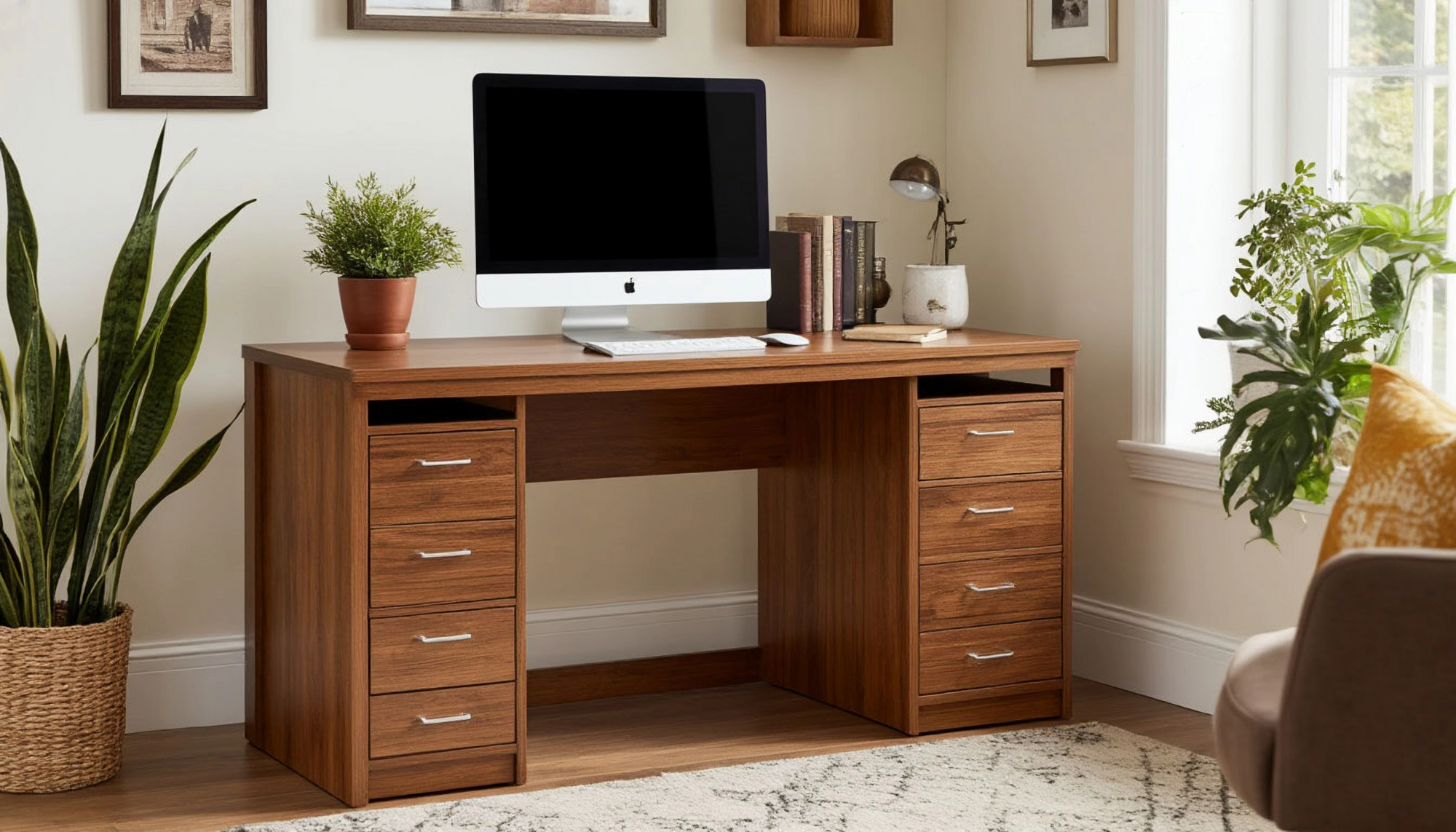 Изготовленный в элегантном цвете орех, этот стол придаст вашему офису или домашнему рабочему месту изысканный вид. Его классический дизайн легко впишется в любой интерьер, будь то строгий офисный стиль с минималистичными линиями или более уютная домашняя обстановка с элементами теплоты и уюта. Приятный на ощупь материал и аккуратные линии делают его не только красивым, но и приятным в использовании. Каждый элемент стола продуман до мелочей, чтобы обеспечить вам максимальный комфорт во время работы.