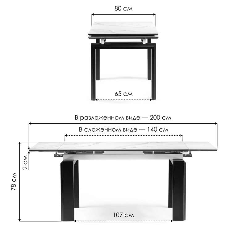Расстояние между ножками: 107 х 65 см. Толщина столешницы: 2,2 см.